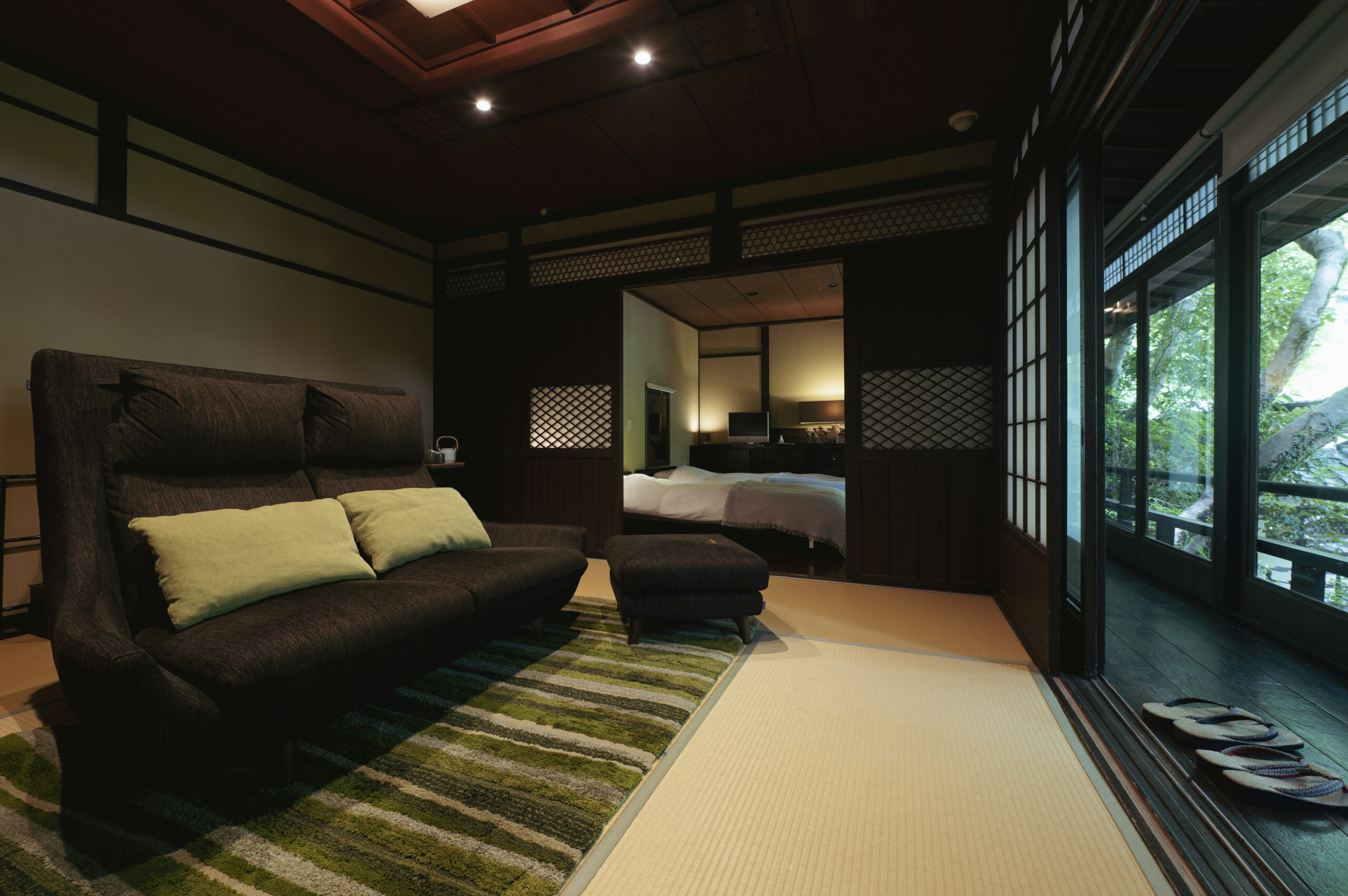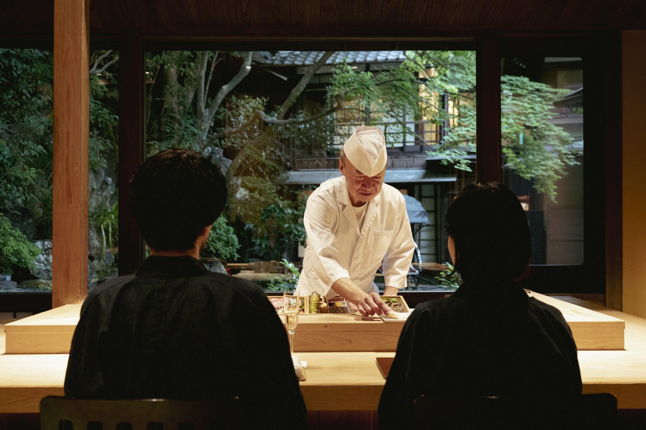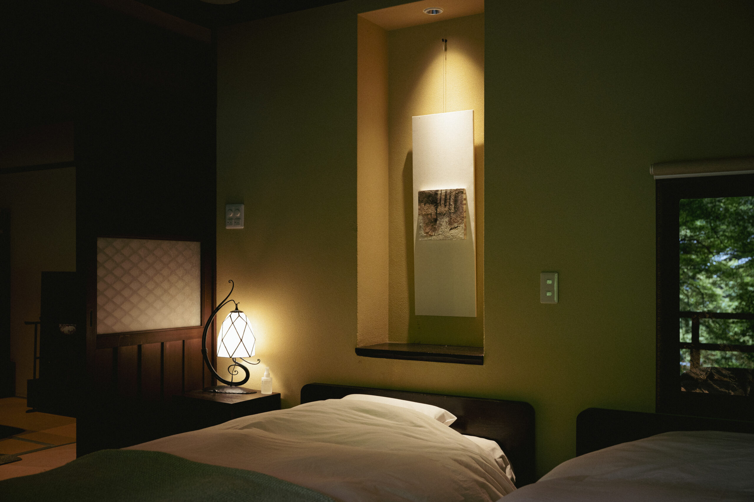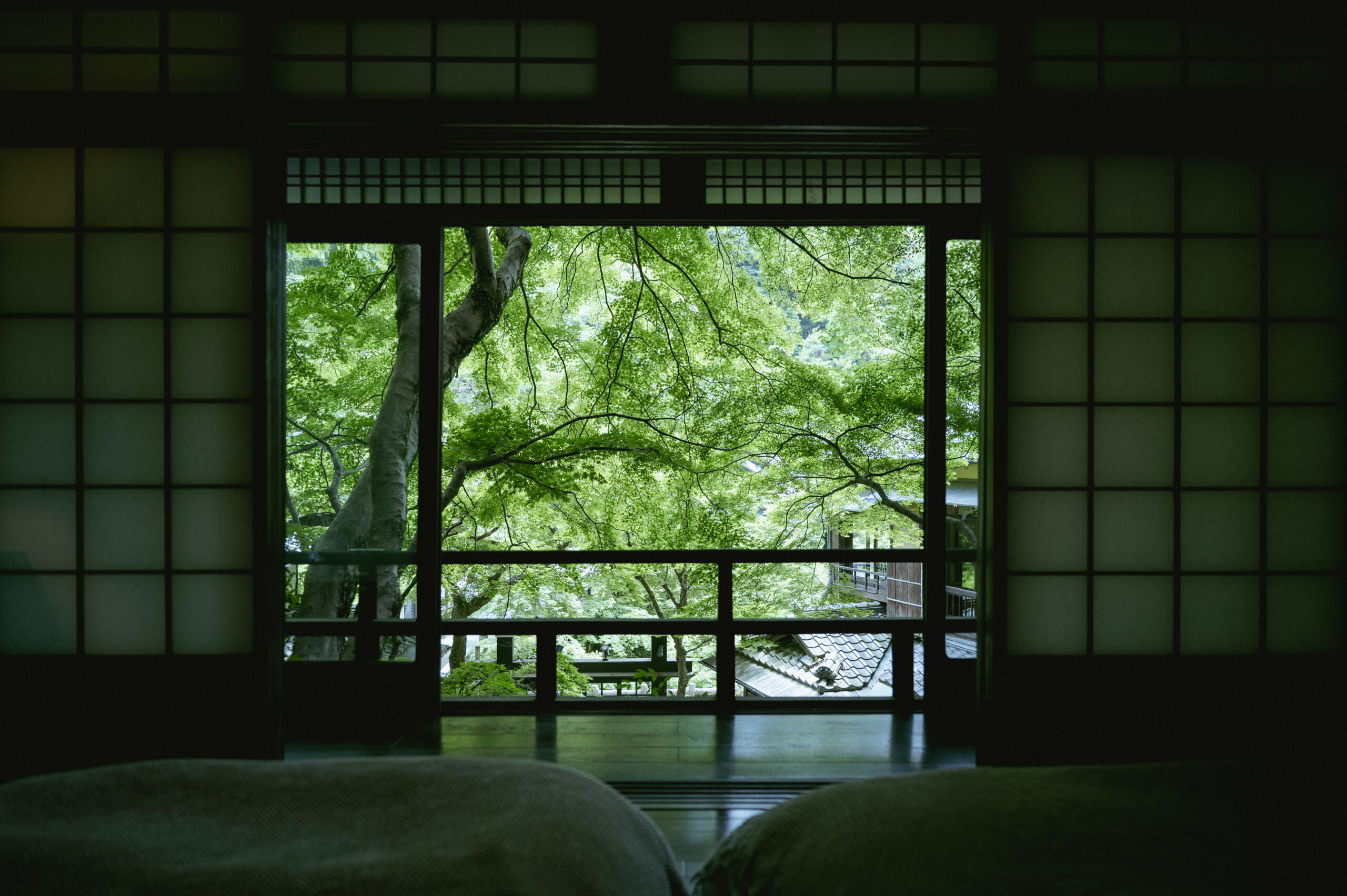 大正時代の趣をそのまま残した木造建築に佇む宿は、四季の自然に抱かれた歴史ある空間を演出しています。宿泊は1日1組限定で、静かな時間をゆったりと過ごせるのが魅力です。特別室「森の詩」からは、大正ガラス越しに庭園のもみじが映り込み、季節ごとに異なる美しさを楽しめます。館内の茶房では、Tannoyのスピーカーから流れる音楽と選りすぐりの260冊の本に囲まれながら、宿泊客だけに提供されるサントリーのウィスキー「響 – Japanese Harmony」を堪能でき、客室以外でも豊かなひとときを過ごせます。レストランでは寿司カウンターでの寿司懐石や、個室・ダイニングでの懐石料理を用意。旬の食材を生かした料理と心のこもったおもてなしは評判を呼び、お祝い事や家族の集まり、ご接待など幅広い場面で利用されています。1日1組限定の結婚式も人気を集める、この宿ならではの特別な体験が待っています。